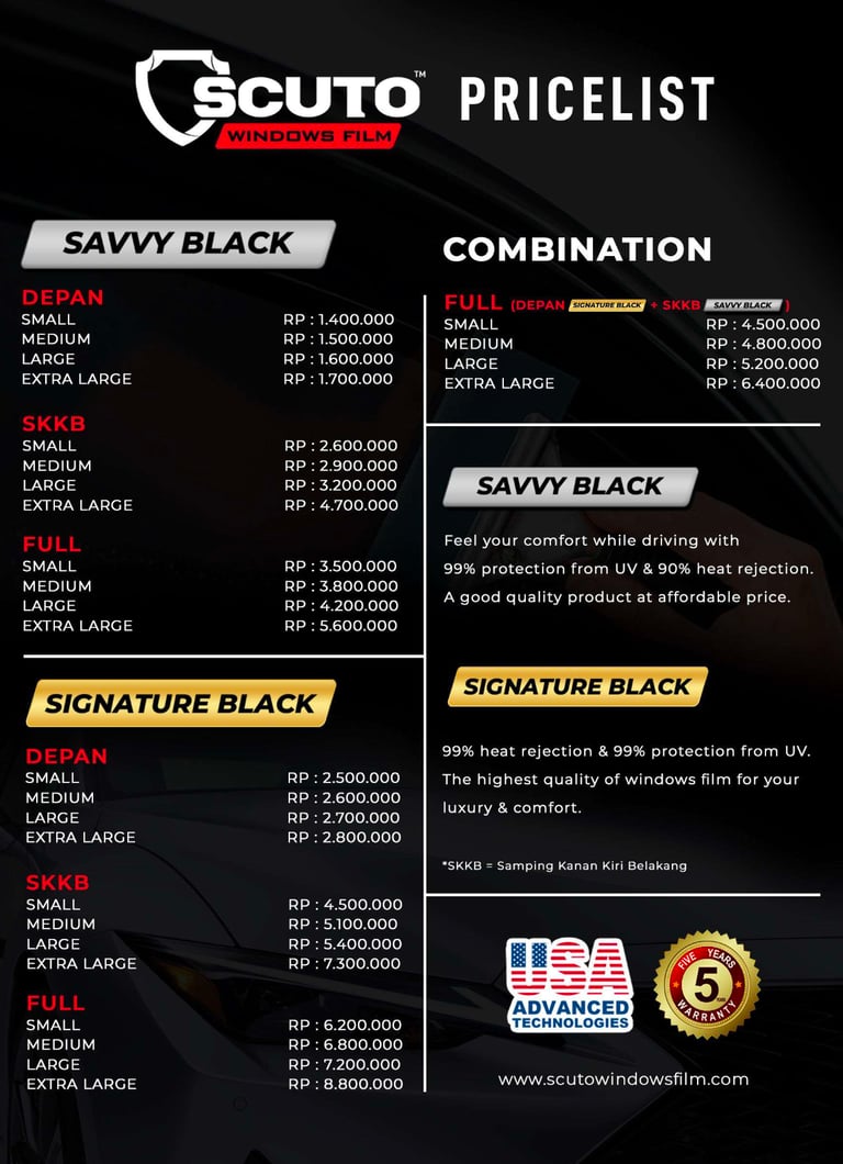 Scuto Windows Film, memiliki kualitas premium yang mampu memberikan perlindungan & keamanan tingkat tinggi yang tersertifikasi (USA Advance Technology) , sehingga mampu memberikan kesan gelap di luar namun terlihat cerah dari dalam.