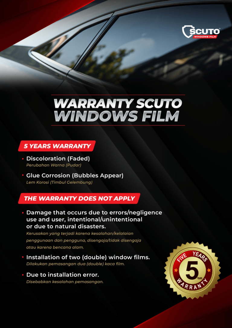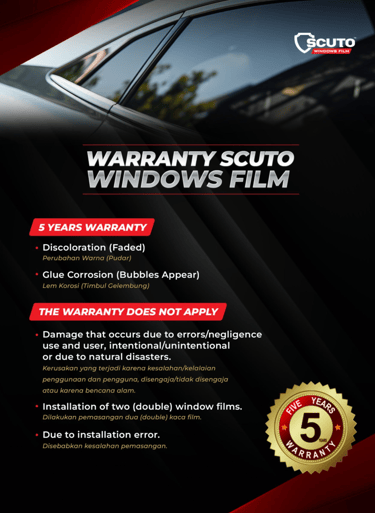 Lapisan keamanannya mampu mencegah pecahan kaca berhamburan saat terjadi benturan. Dengan daya tahan tinggi dan tampilan elegan, Kaca Film Premium Scuto adalah investasi cerdas untuk meningkatkan kenyamanan dan efisiensi energi di rumah Anda.