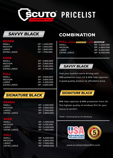 Dengan teknologi canggih, Kaca Film Scuto berkualitas tinggi mampu mengurangi panas hingga 80% serta melindungi dari sinar UV hingga 99%.